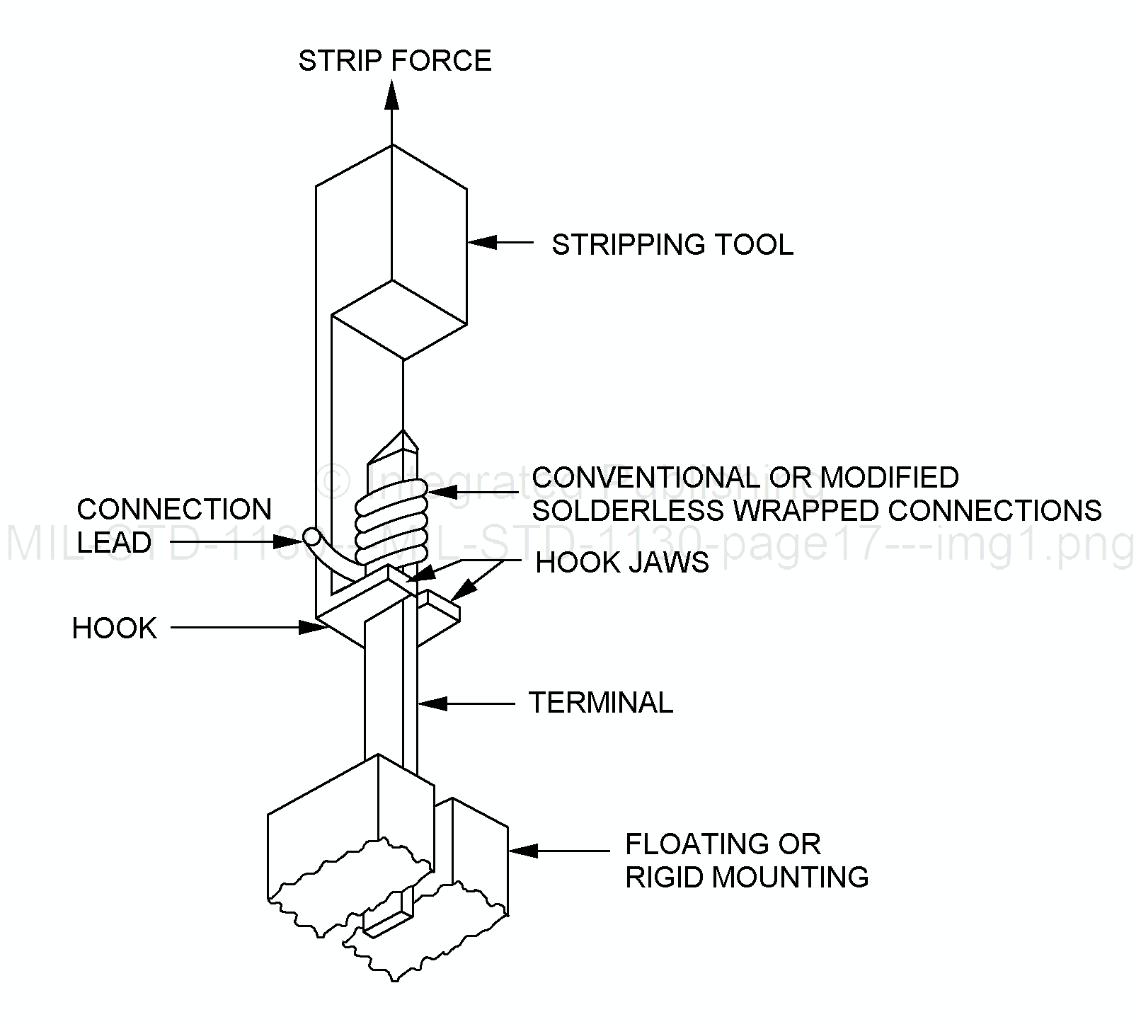 5.6.1 Strip force. A completed solderless wrapped connection, with the minimum number of turns listed in table II, shall be capable of meeting the minimum strip force specified in table IV. The minimum strip force shall be obtained before the wrapped connection has been moved along the wrappost a length equivalent to the diameter of the conductor used on the wrappost. The samples shall be tested using a test fixture illustrated in figure 13. The clearance between the wrappost and the test fixture jaws shall not exceed 70 percent of the wire diameter. The stripping force shall be applied at a uniform rate of 1 to 10 inches per minute.