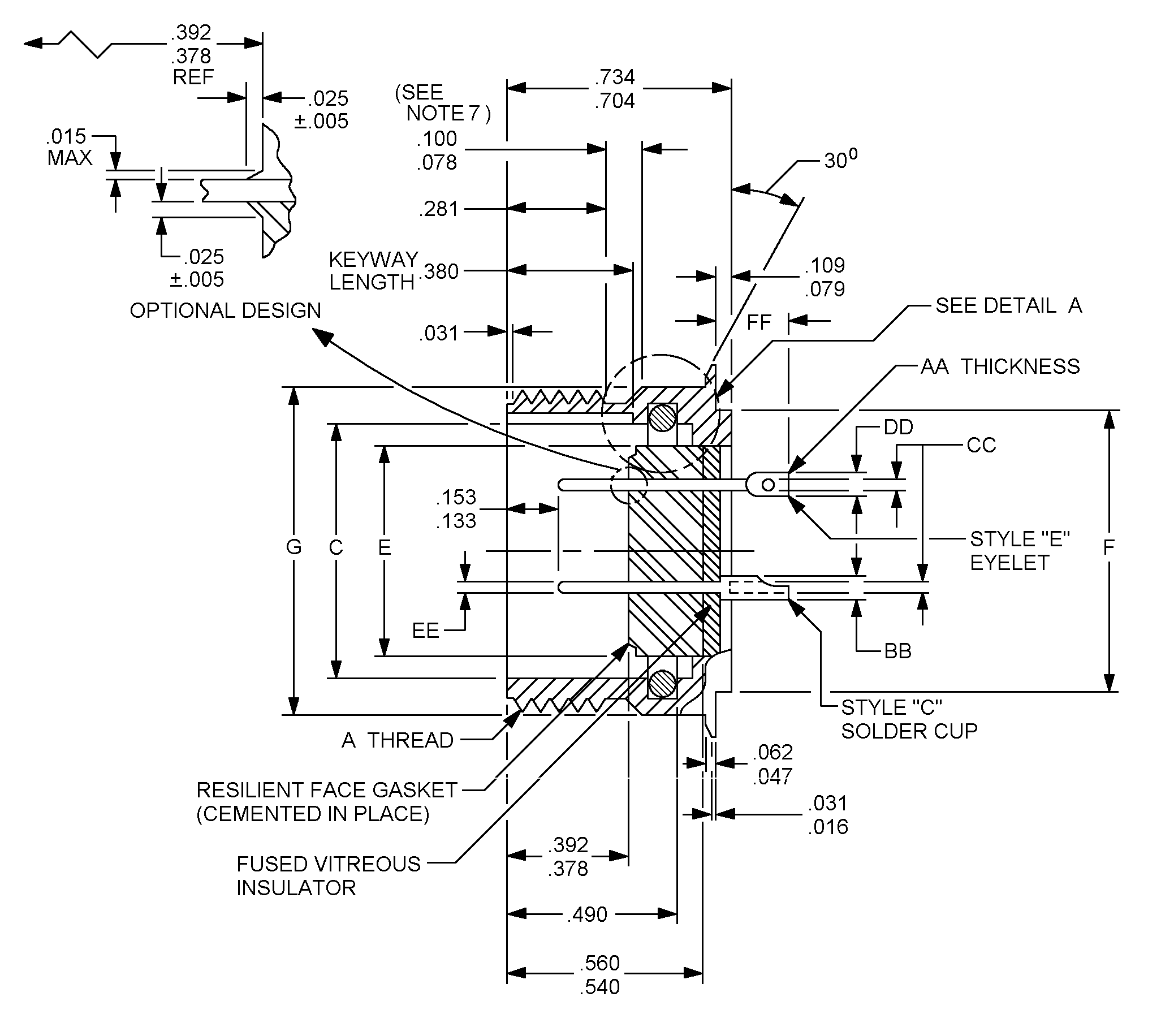 FIGURE 1. Receptacle, class H (hermetic) dimensions.