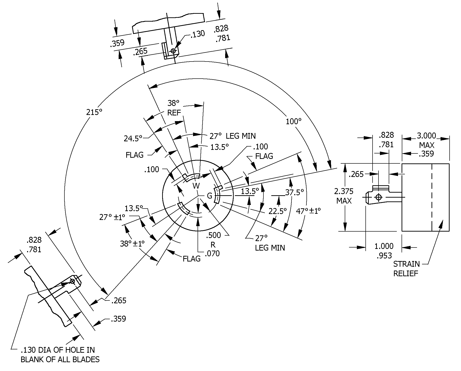 3. Unless otherwise specified, tolerance is ±.005 (0.13 mm) on all decimals and ±5° on angles.